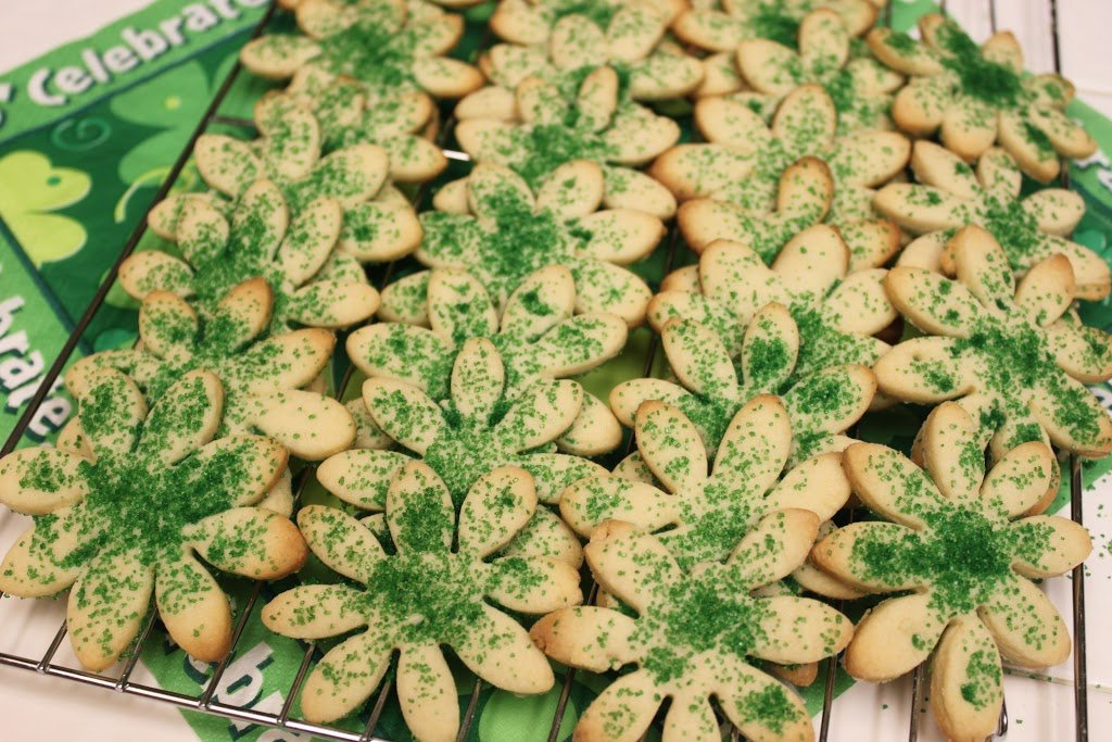 Once again, this year, I used my flower-shaped cutter and decorated the cookies with green sprinkles, pretending I had shamrocks. I have now ordered a SHAMROCK cookie cutter for next year. I just may need to try it out next weekend, though, for good luck.